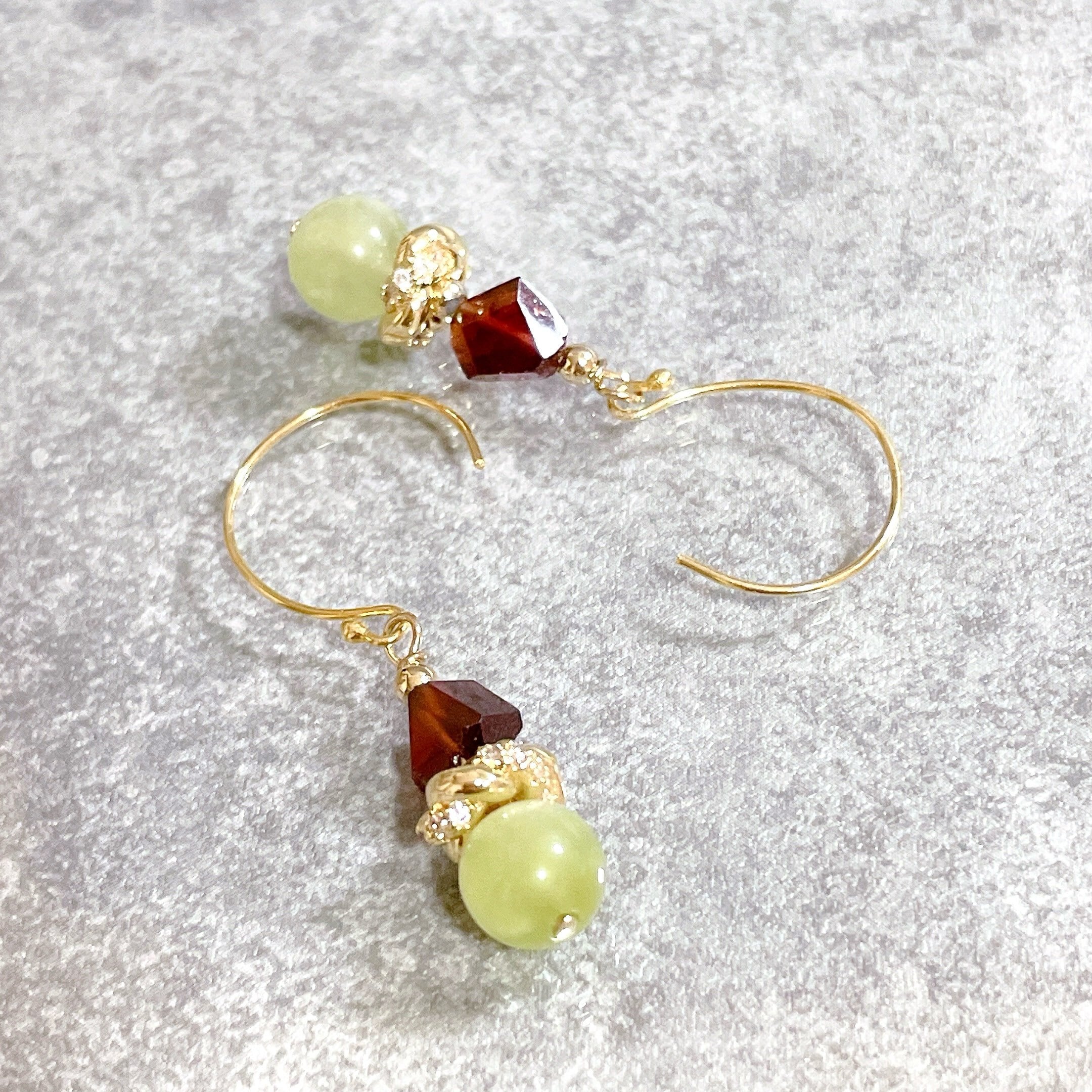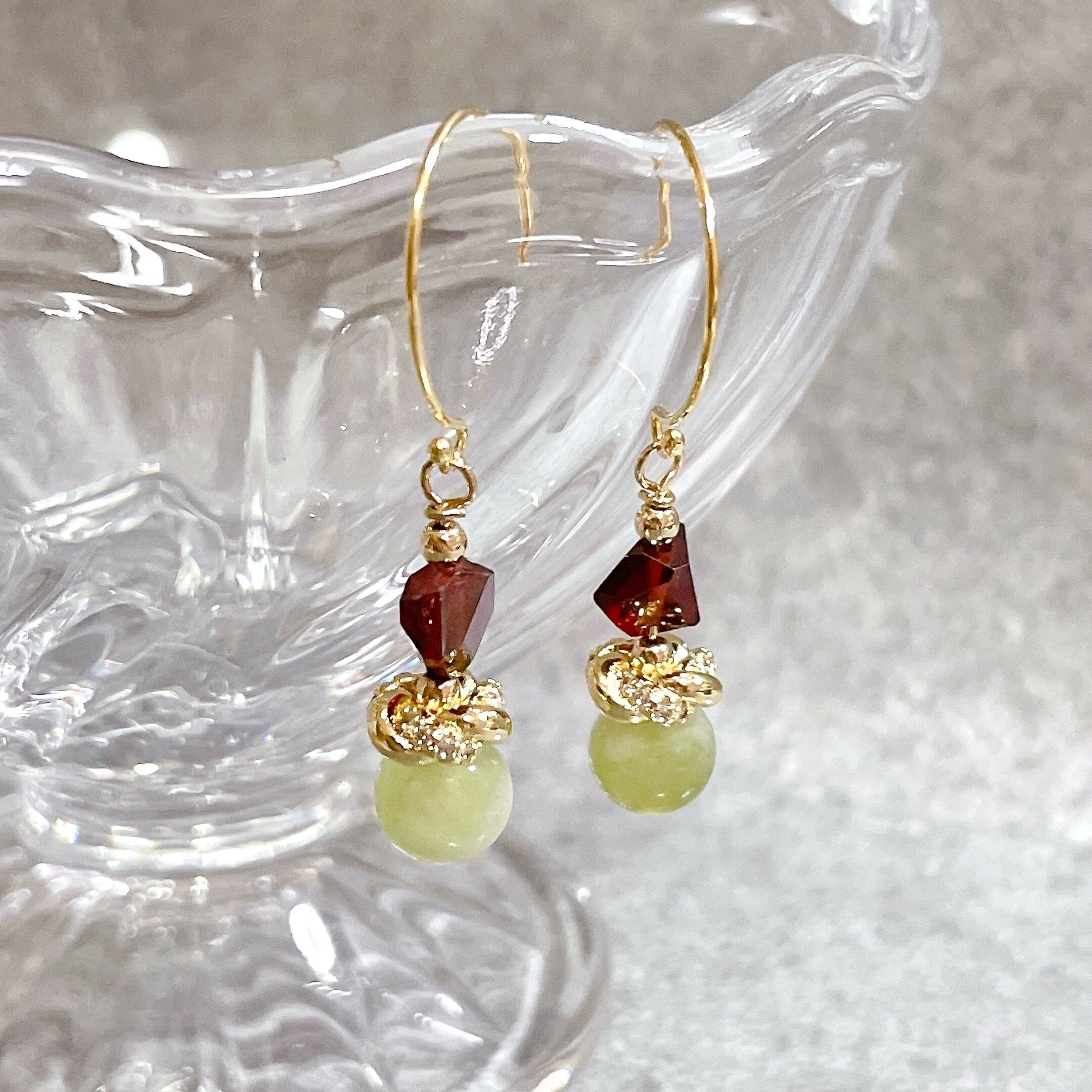 優しく爽やかなマスカットカラーのサーペンティンと、柘榴石という和名を持ったガーネットを紡いだピアスになります。