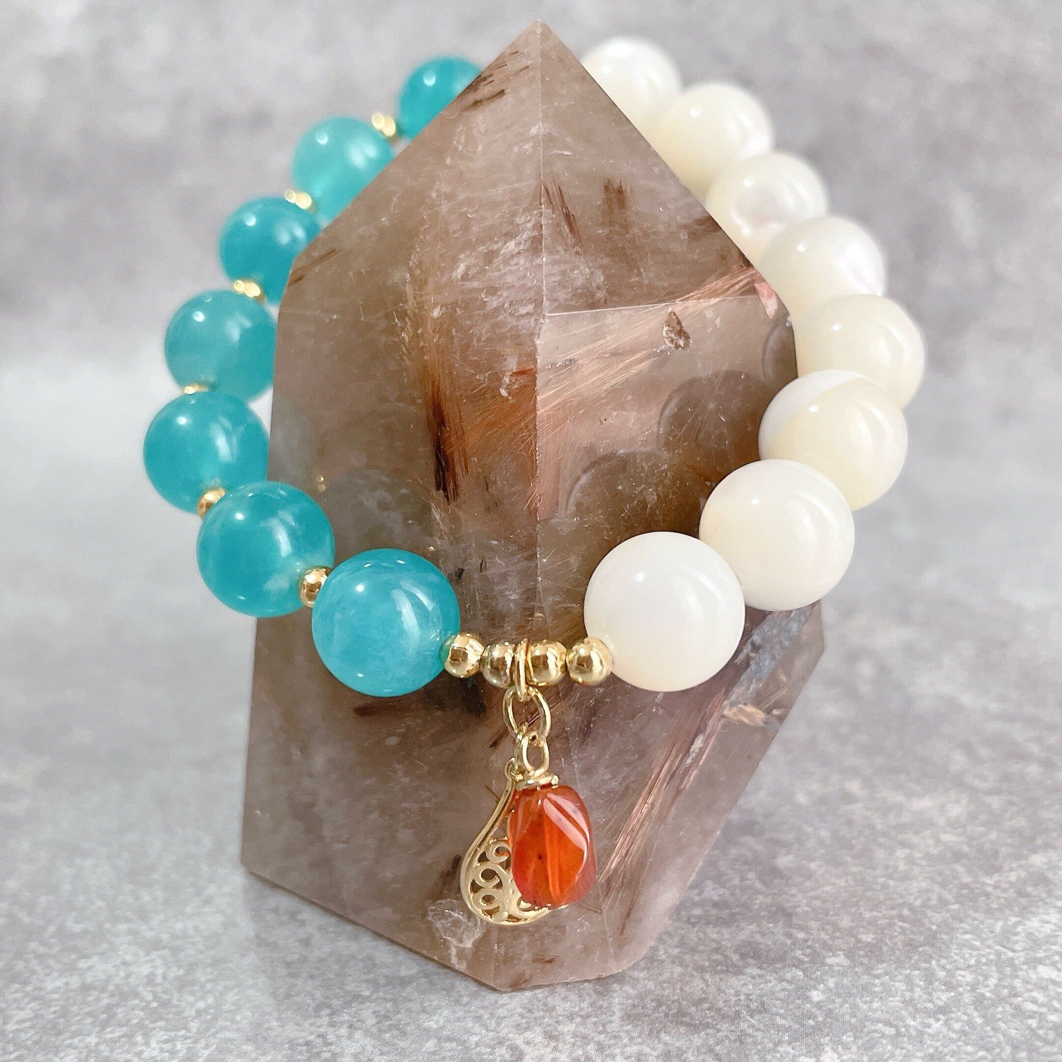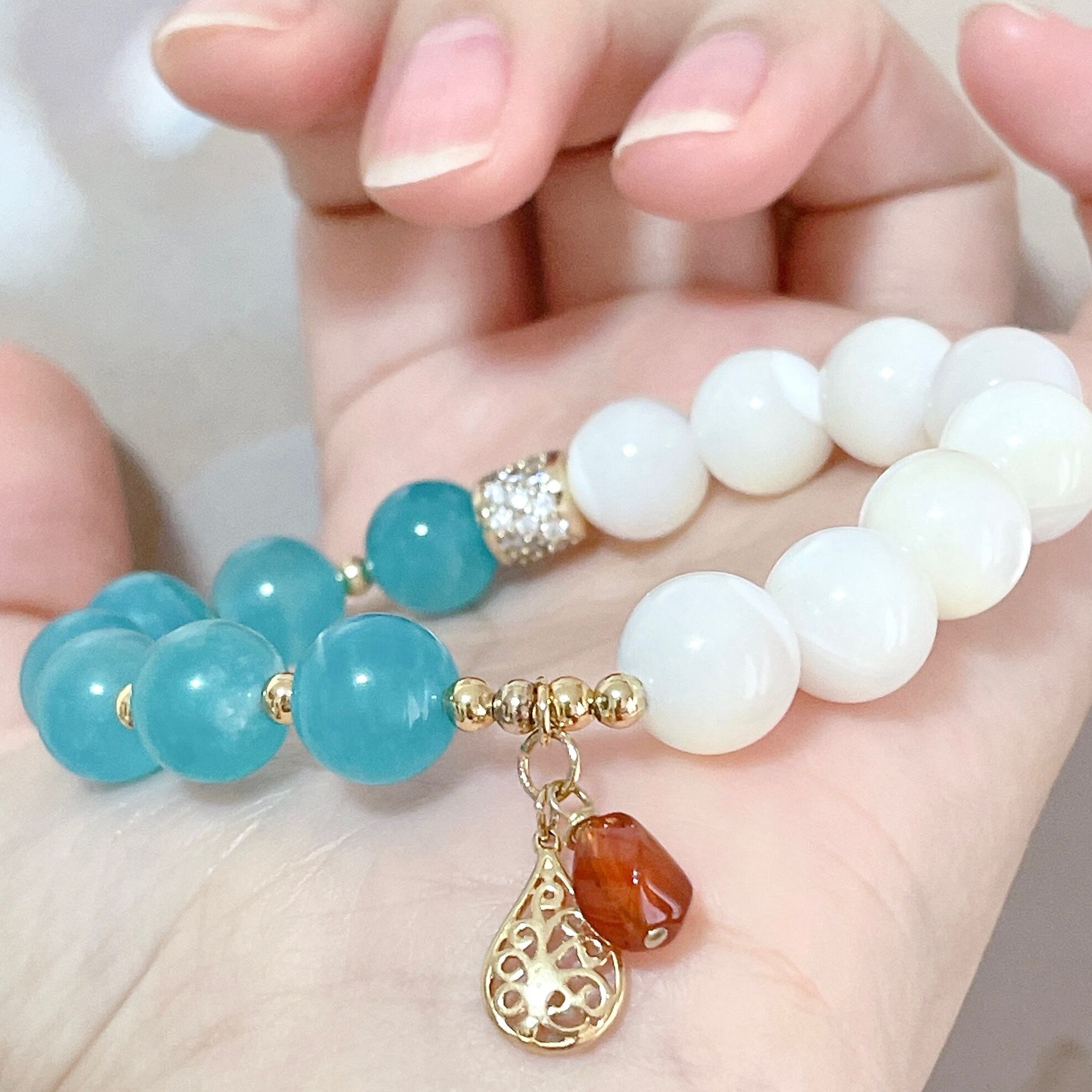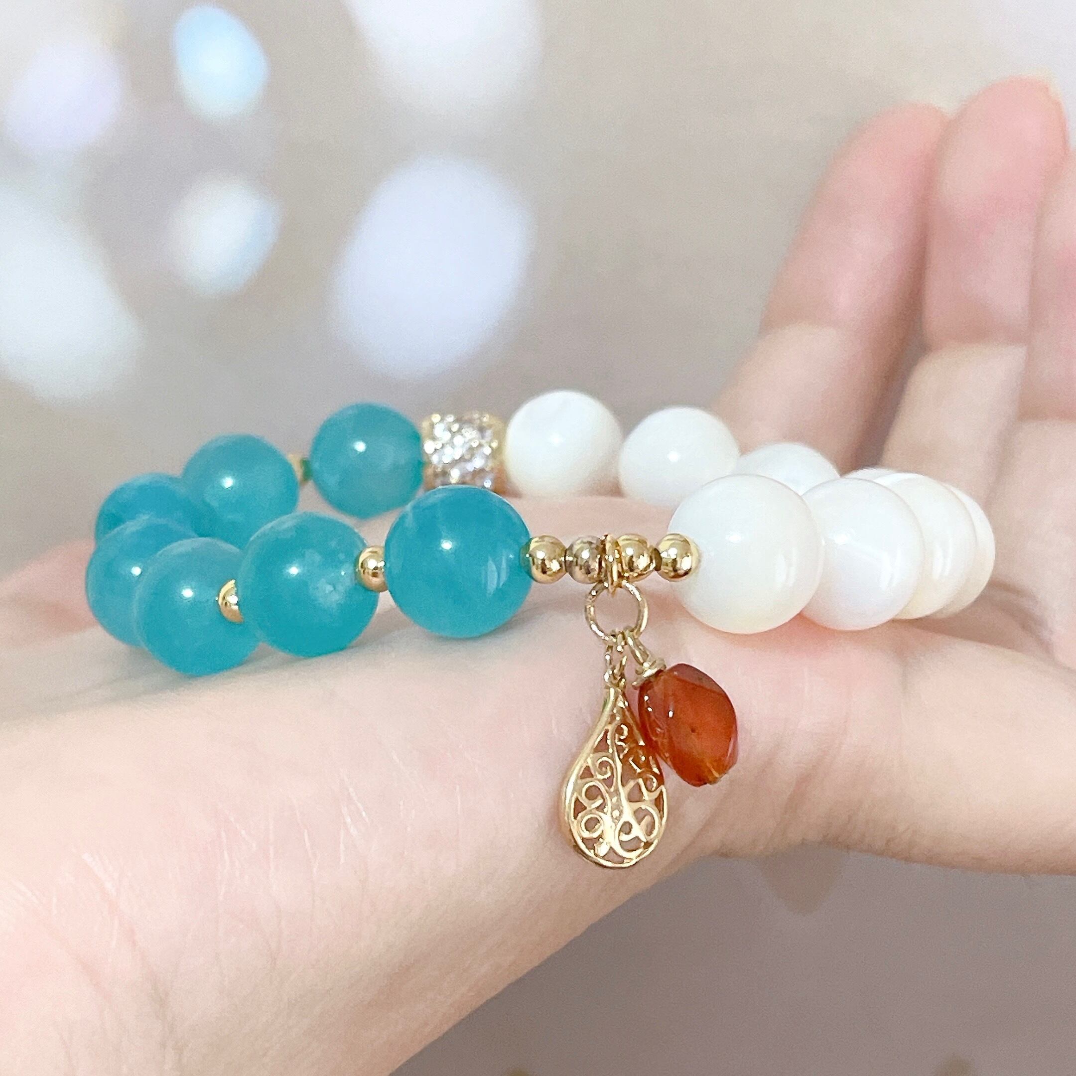 鮮やかブルーのアマゾナイトとホワイトを基調に虹色がかった輝きが美しいマザーオブパールを組み合わせたブレスレットです。暑い夏を涼しくしてくれそうなブルーとホワイトのコントラストに、オレンジカラーのカーネリアンのチャームがアクセントになっているこの季節にぴったりなブレスレットに仕上がっています。