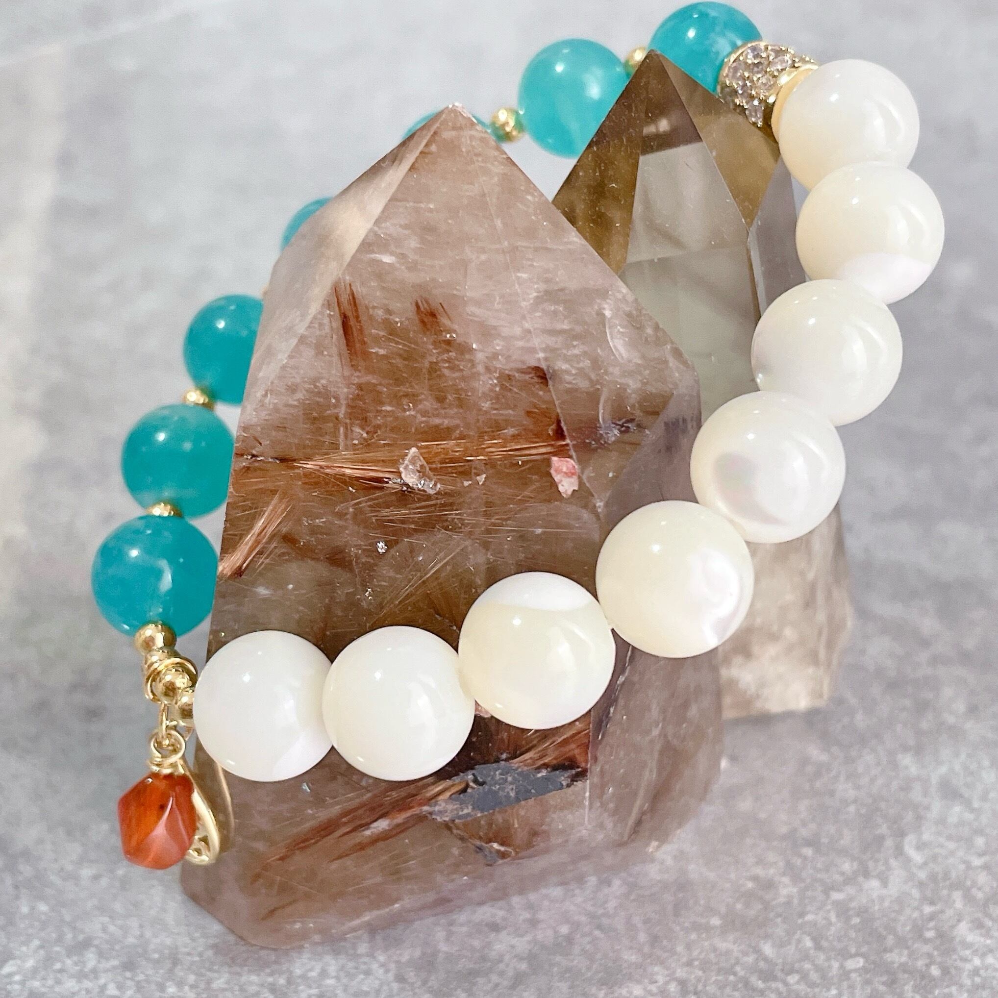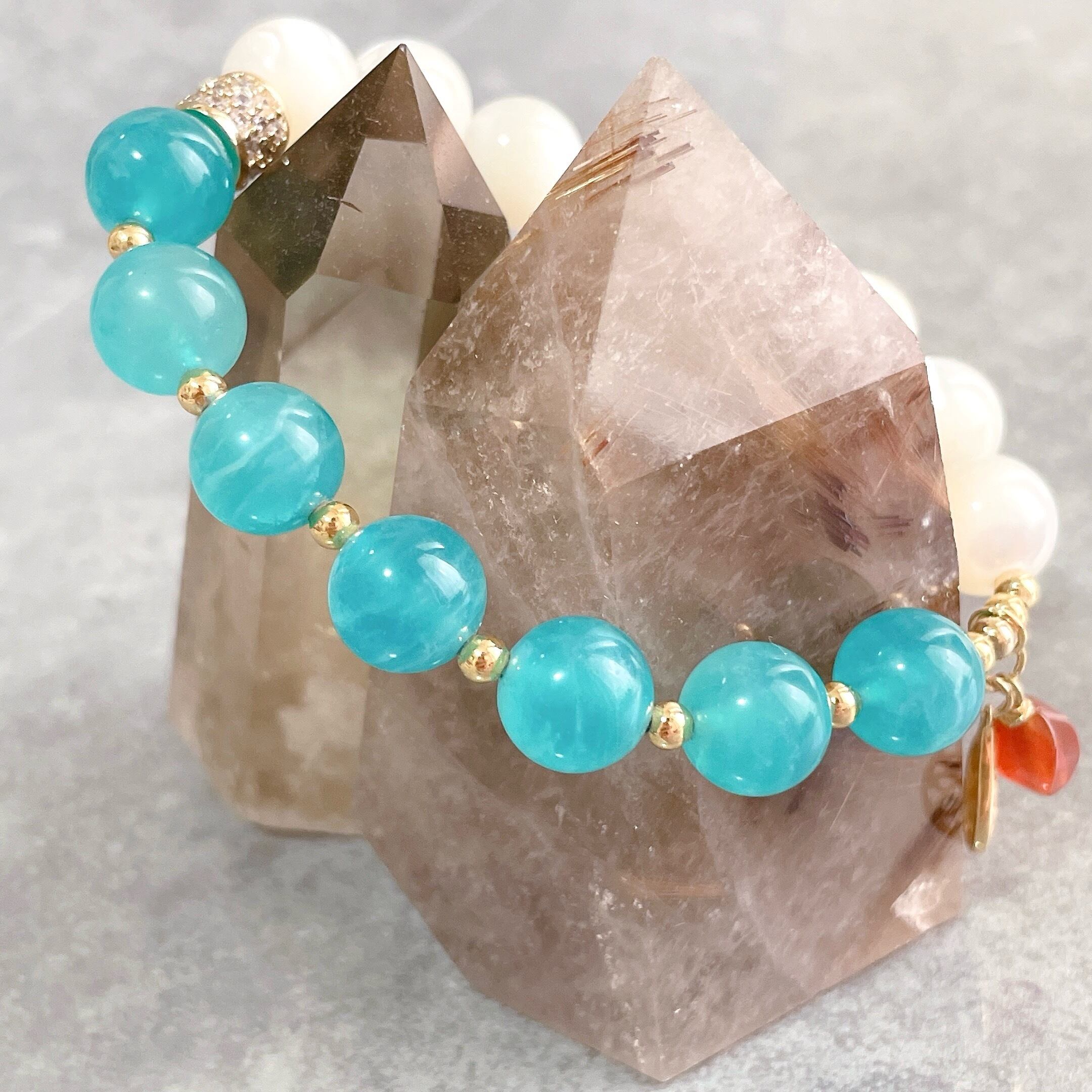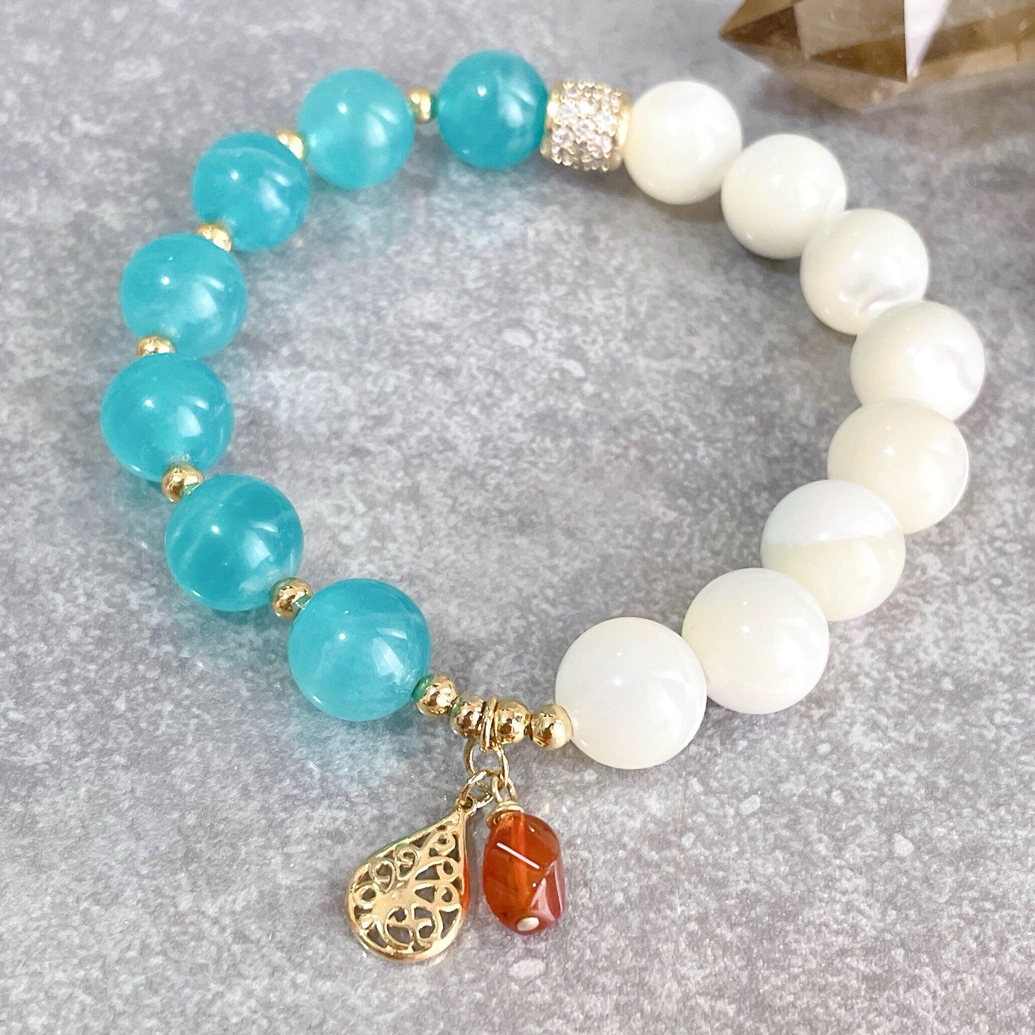 鮮やかブルーのアマゾナイトとホワイトを基調に虹色がかった輝きが美しいマザーオブパールを組み合わせたブレスレットです。暑い夏を涼しくしてくれそうなブルーとホワイトのコントラストに、オレンジカラーのカーネリアンのチャームがアクセントになっているこの季節にぴったりなブレスレットに仕上がっています。
