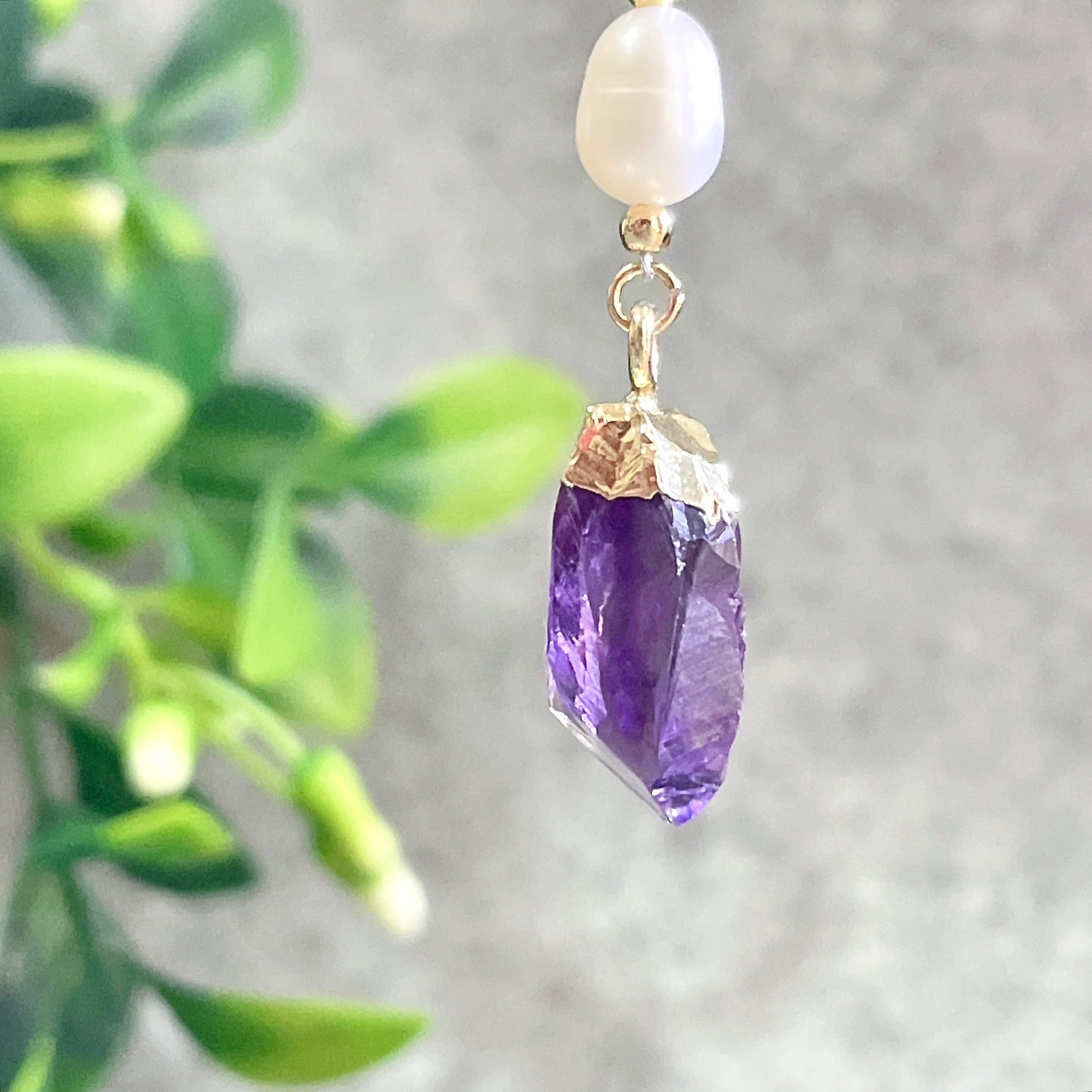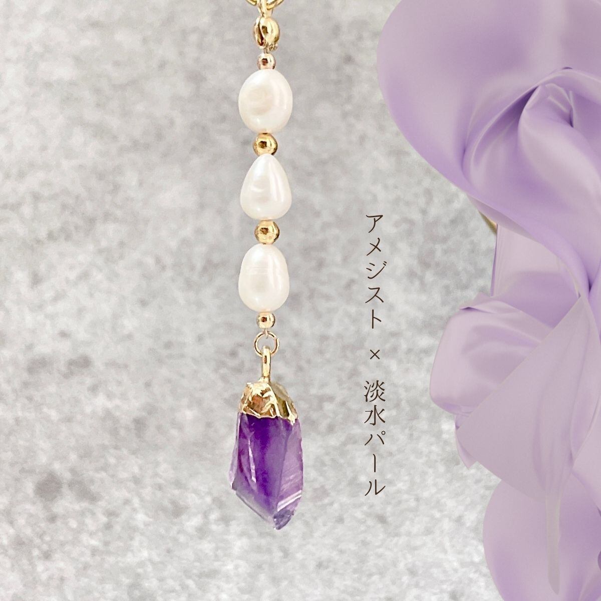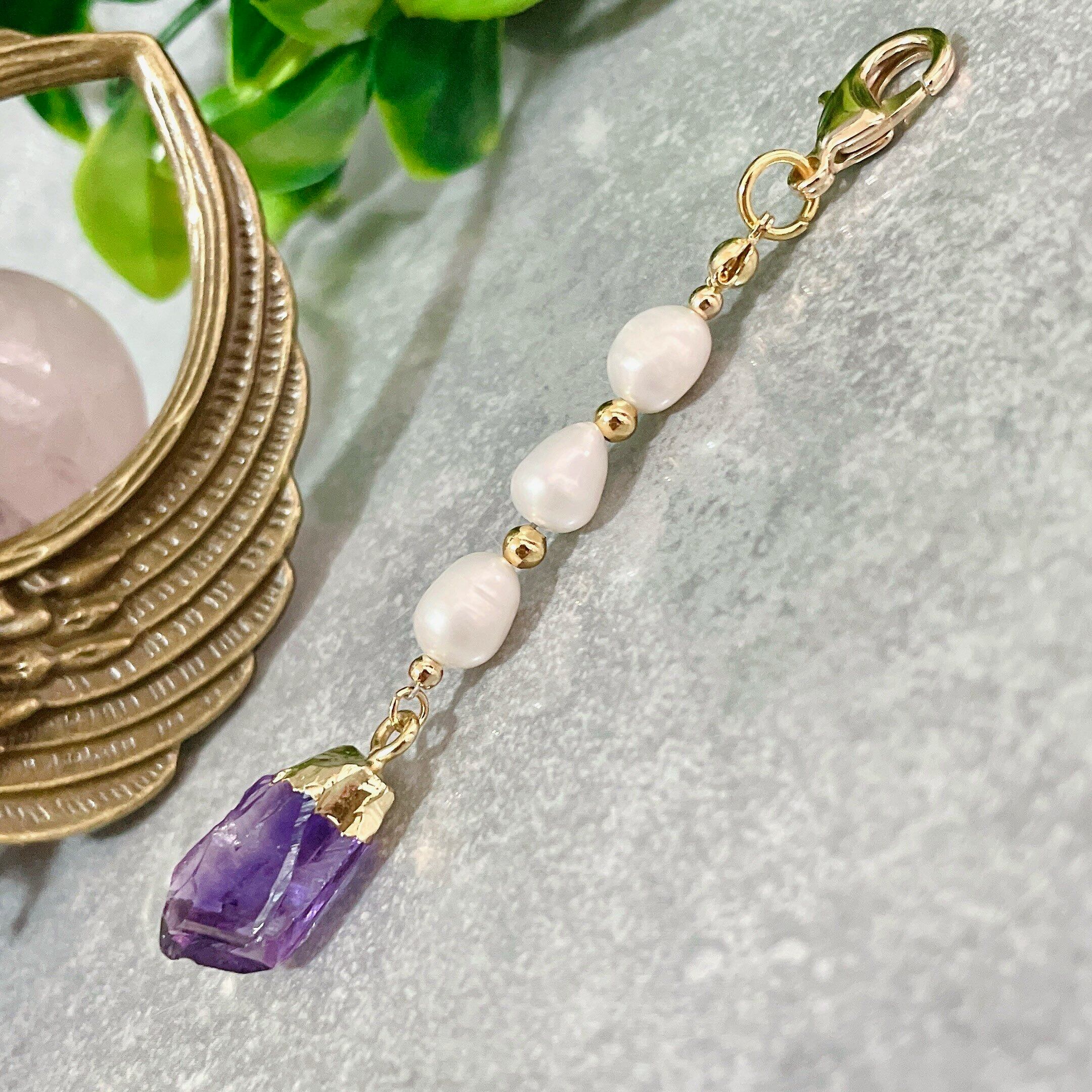 濃いめのパープルが美しく「高貴」の象徴とされるアメジストと、やわらかい光沢感で優しい風合いを持つ淡水パールを使用した上品で大人可愛いチャームです。