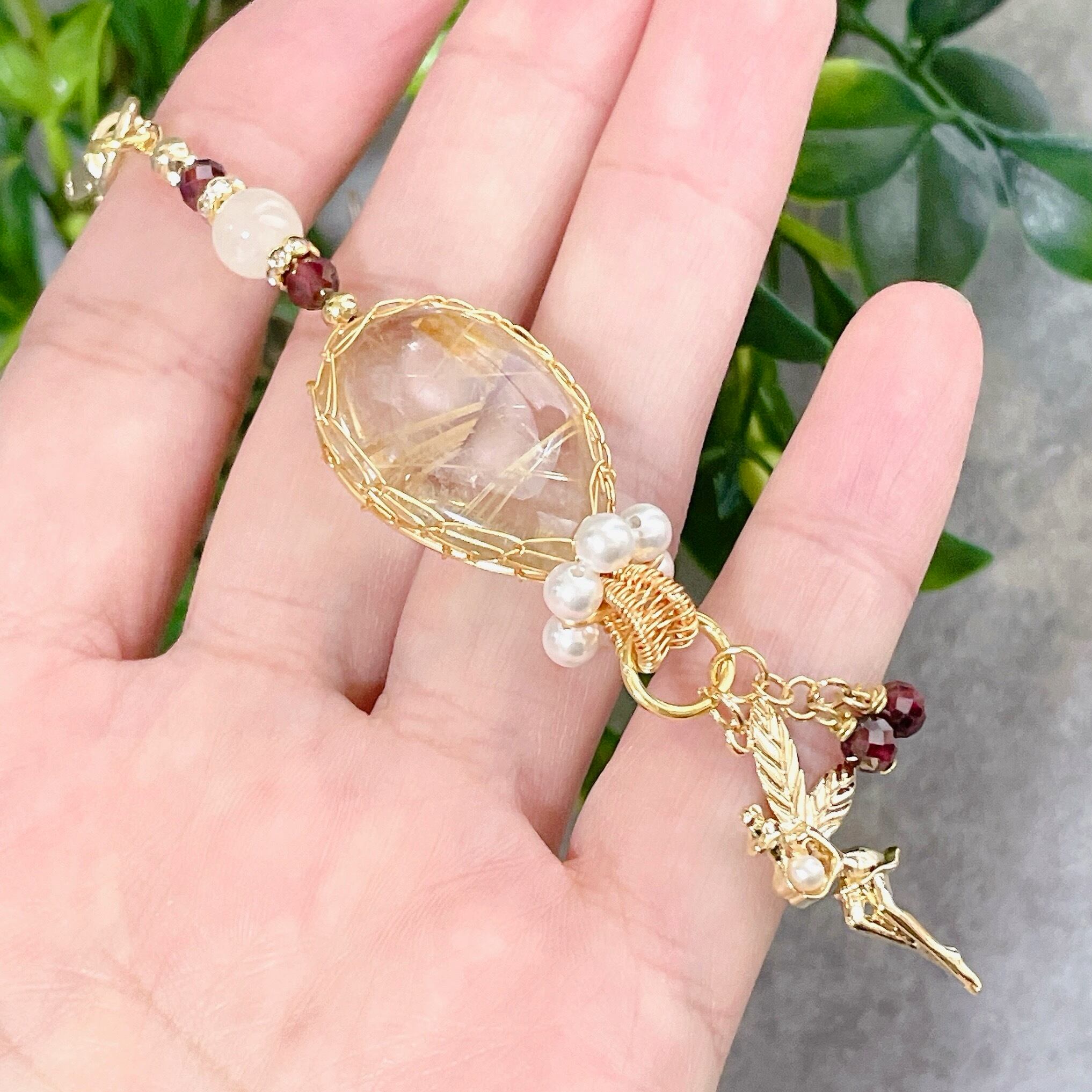 ワイヤーで飾られたしずく型のゴールドルチルクォーツに妖精をモチーフにしたチャームと小粒のガーネットが付いたキーホルダーです。ゴールドルチルクォーツは透明度の高い水晶に細い針と太い針の両方がが入っていてとても美しいです。