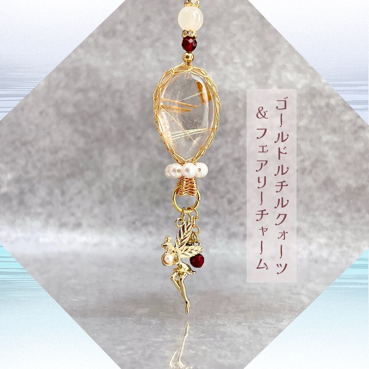 ゴールドルチルクォーツとフェアリーチャーム 天然石キーホルダー