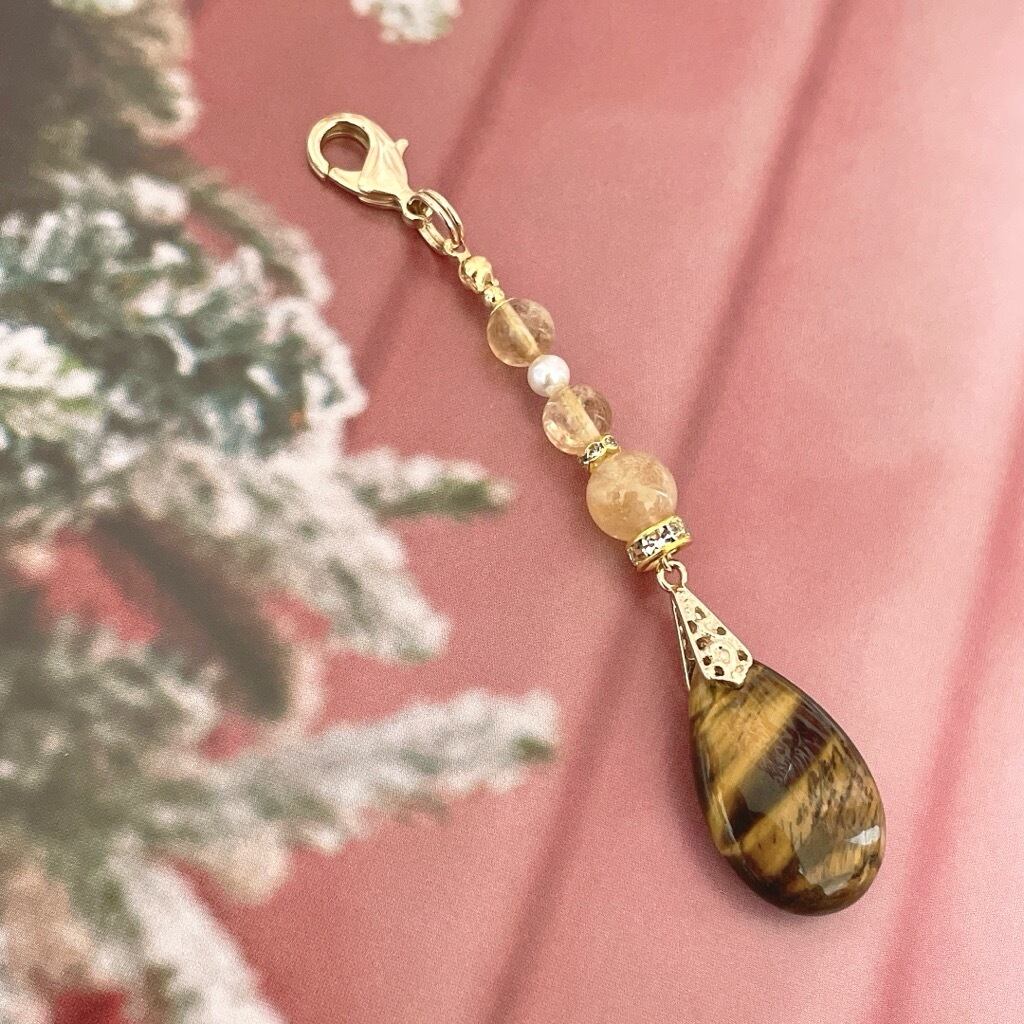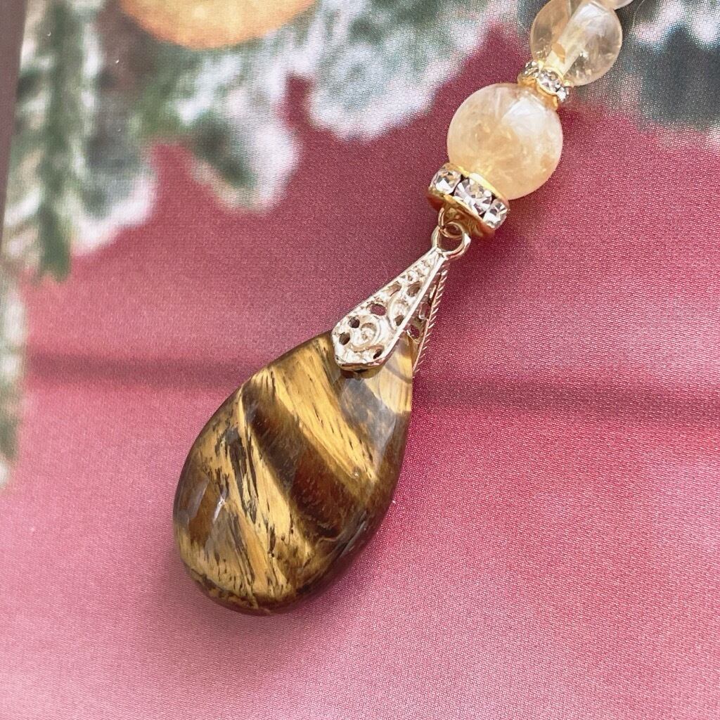 黄色と黒のコントラストに虎の目のように見える美しい輝きを放つタイガーアイに同系色のシトリンを組み合わせたチャームになります。魔除けのお守りとしてもおすすめです。