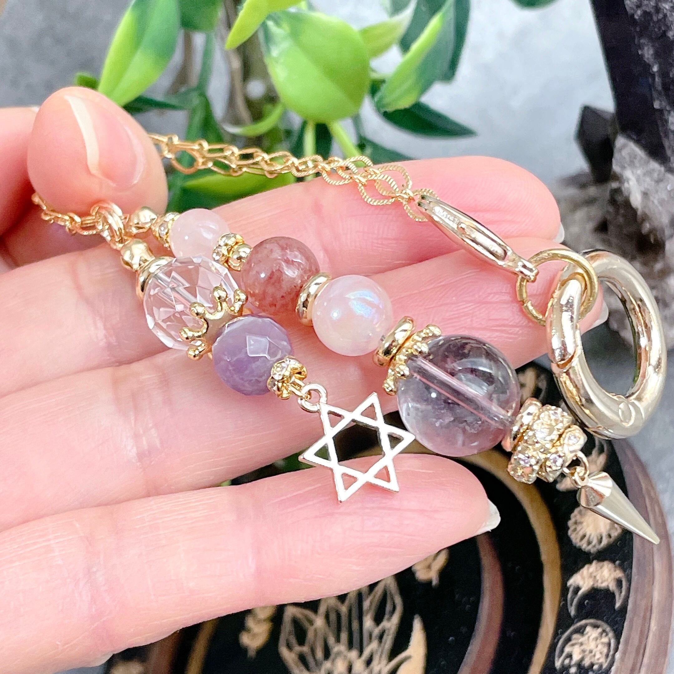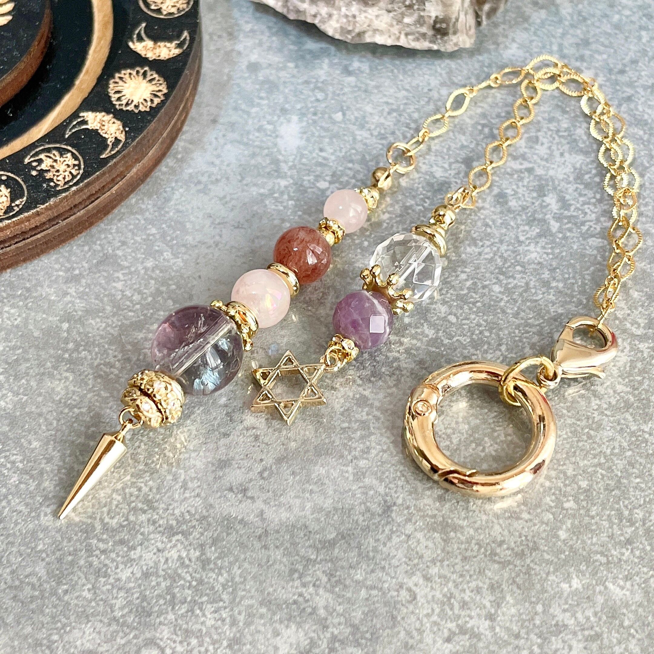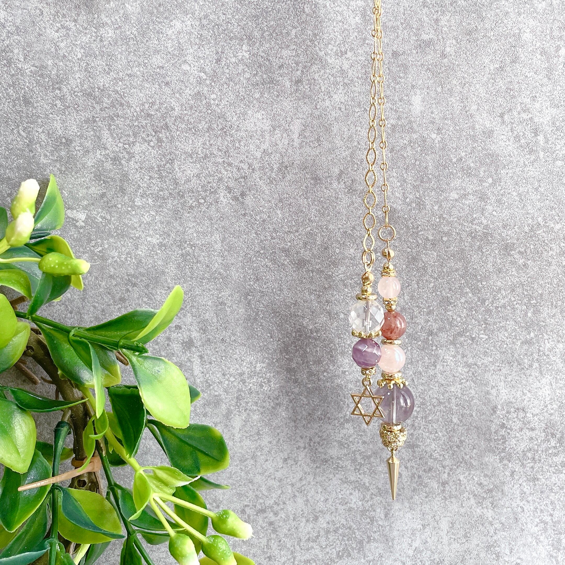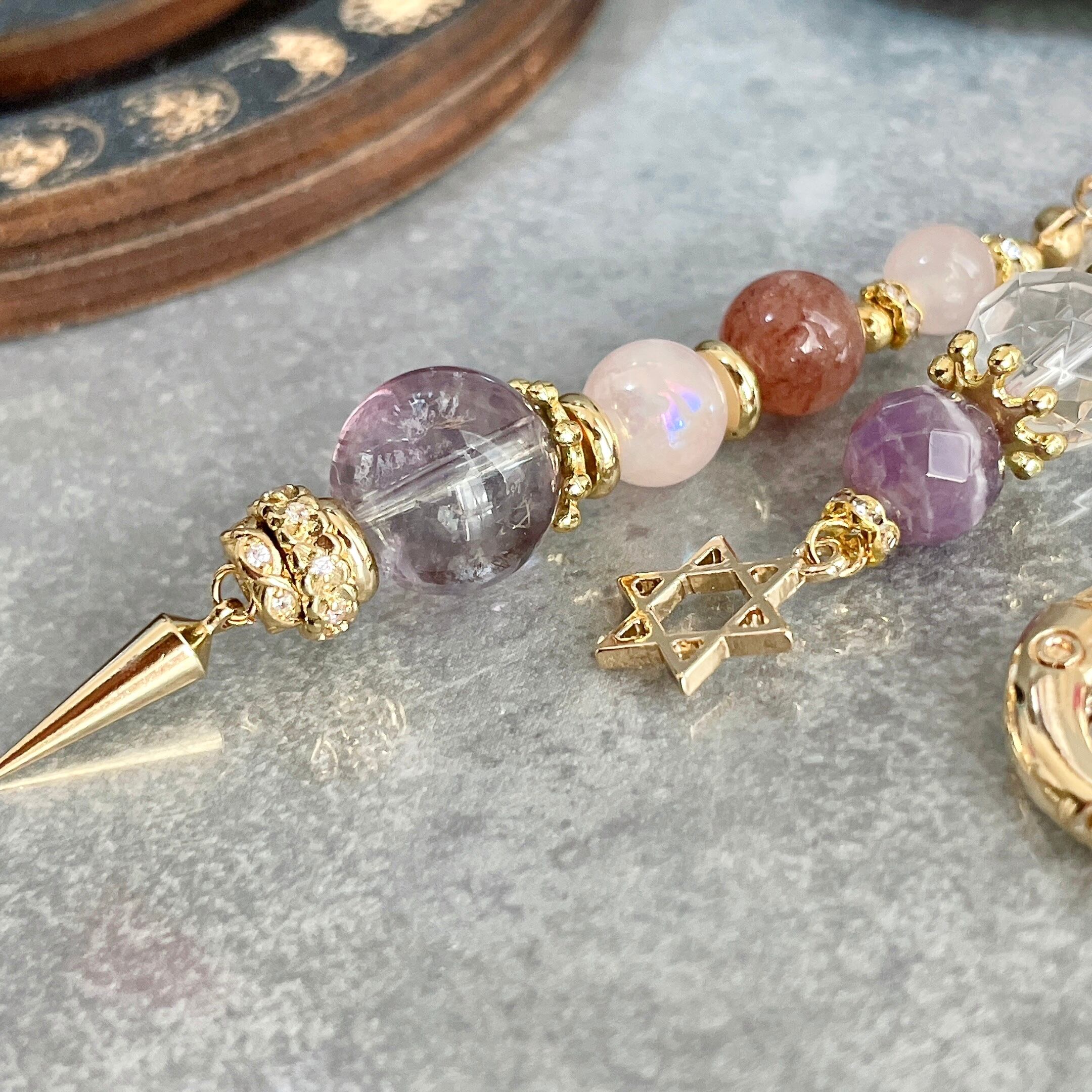 六芒星チャームがついた魔法道具の中に入っていそうなデザインのインテリア用チャームになります。サンキャッチャーのようにお部屋に吊るしたり車内のインテリア、フック部分を取り外してペンデュラムのようにお使いいただくことも可能です。