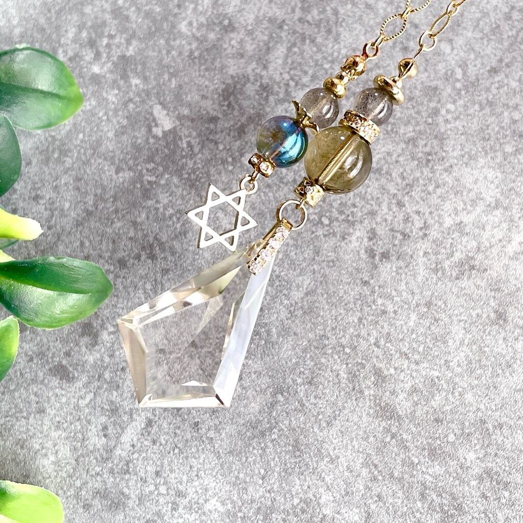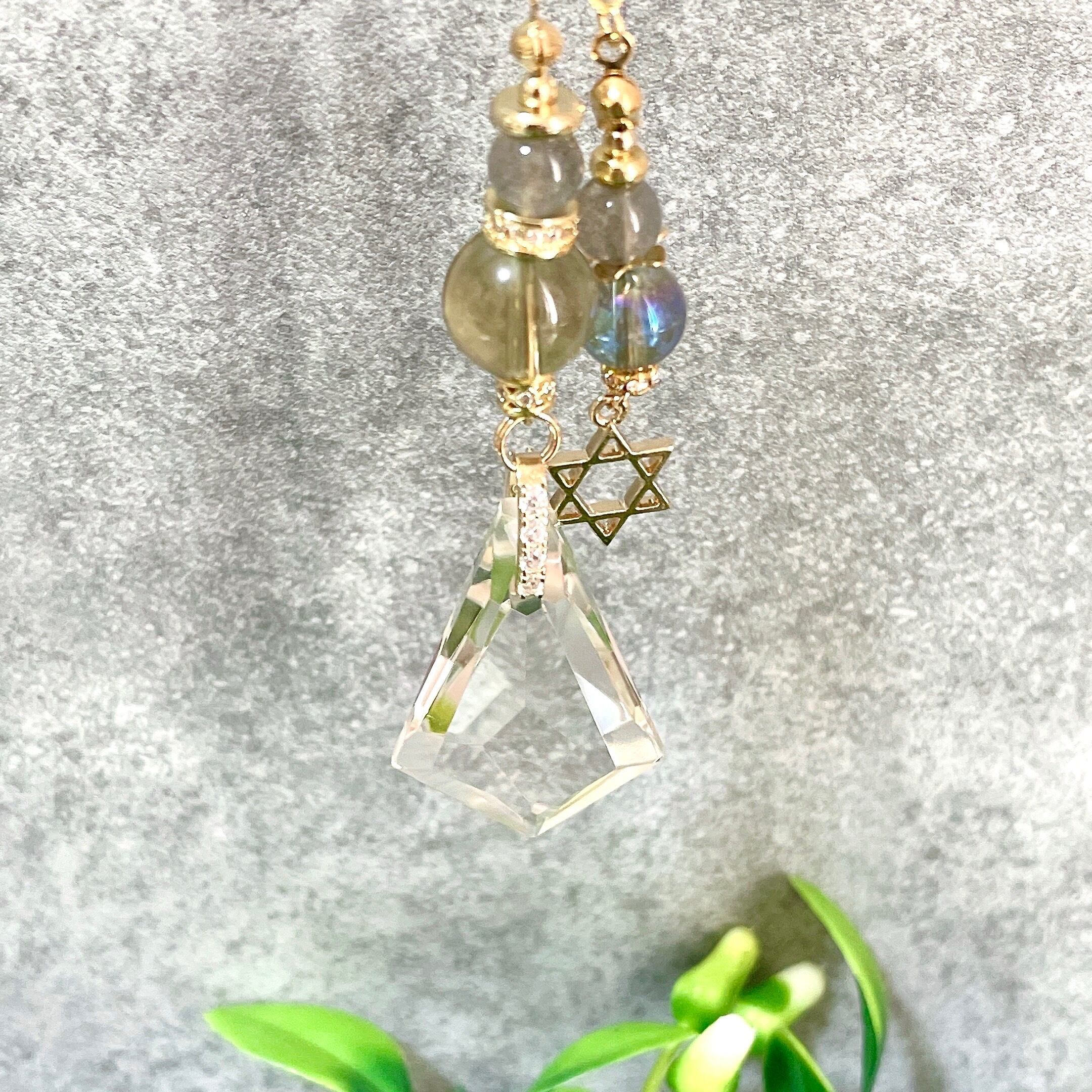 透明度の高い大きめサイズの水晶をメインに、ラブラドライト、スモーキークォーツを組み合わせたインテリア用のチャームになります。水晶にはカットが施されているため光を反射して美しい輝きを放ちます。サンキャッチャーのようにお部屋に吊るしたり車内のインテリアなどにお使いください。