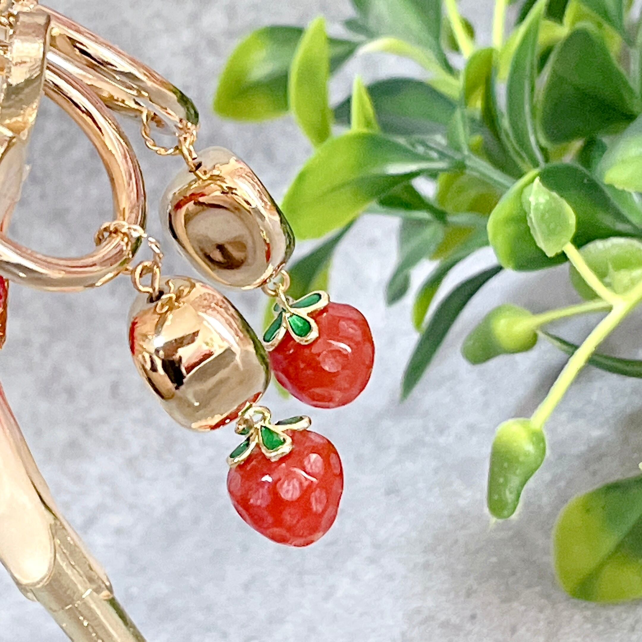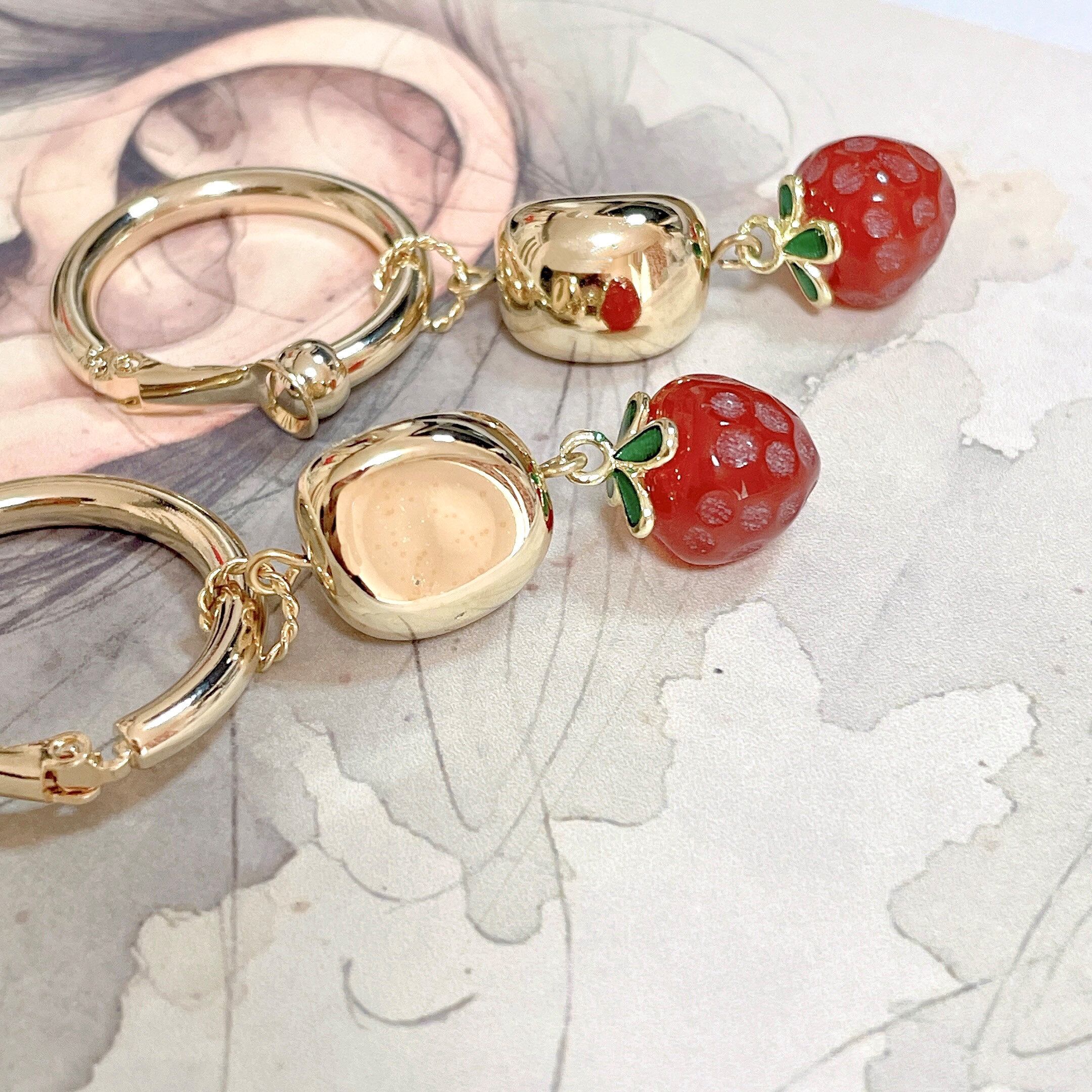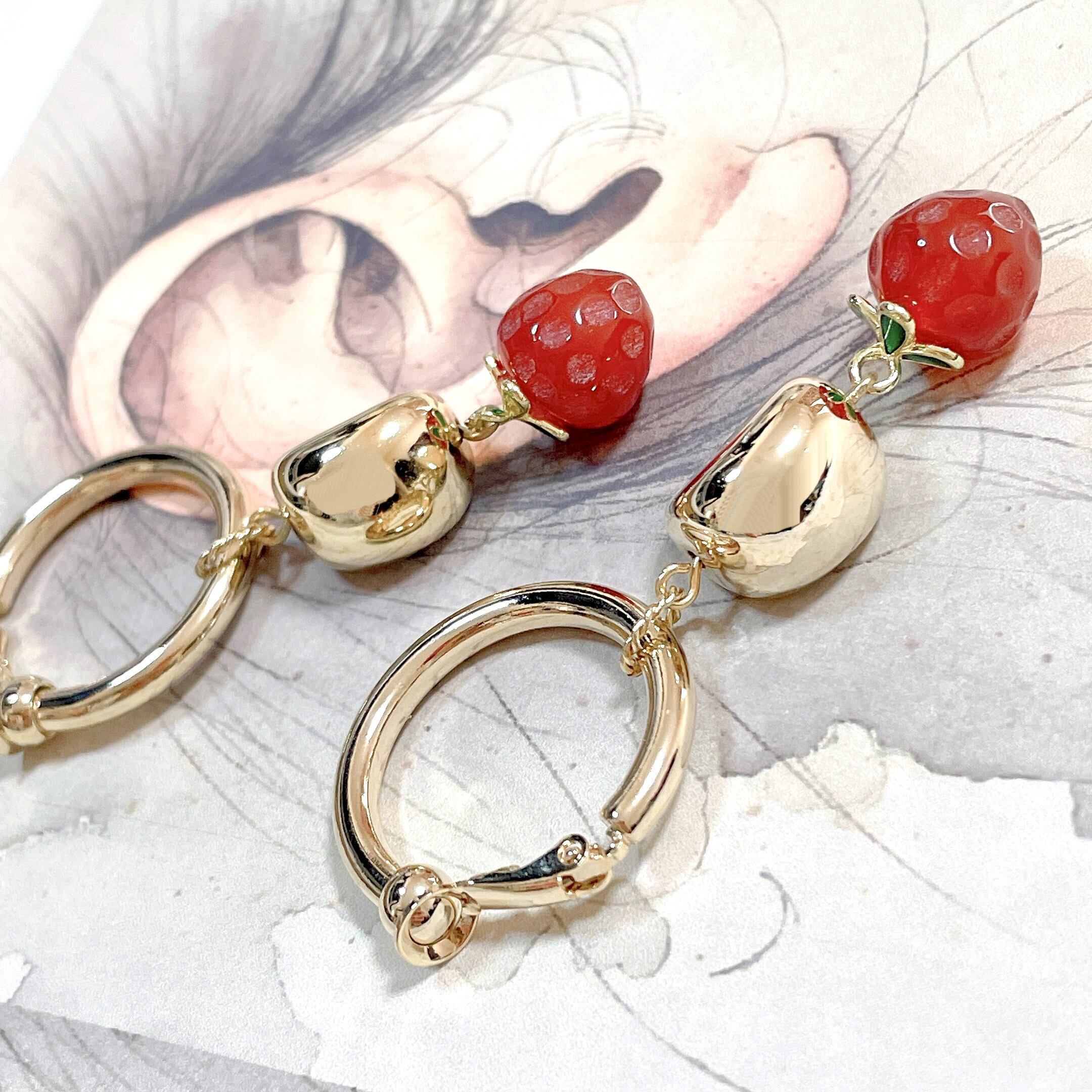 可愛い苺をモチーフにしたレッドアゲートに大ぶりメタルパーツを組み合わせたイヤリングです。ボリューム感のあるシンプルなフープを使用し、可愛くなりすぎないカジュアルなスタイルに取り入れやすいデザインに仕上がっています。
