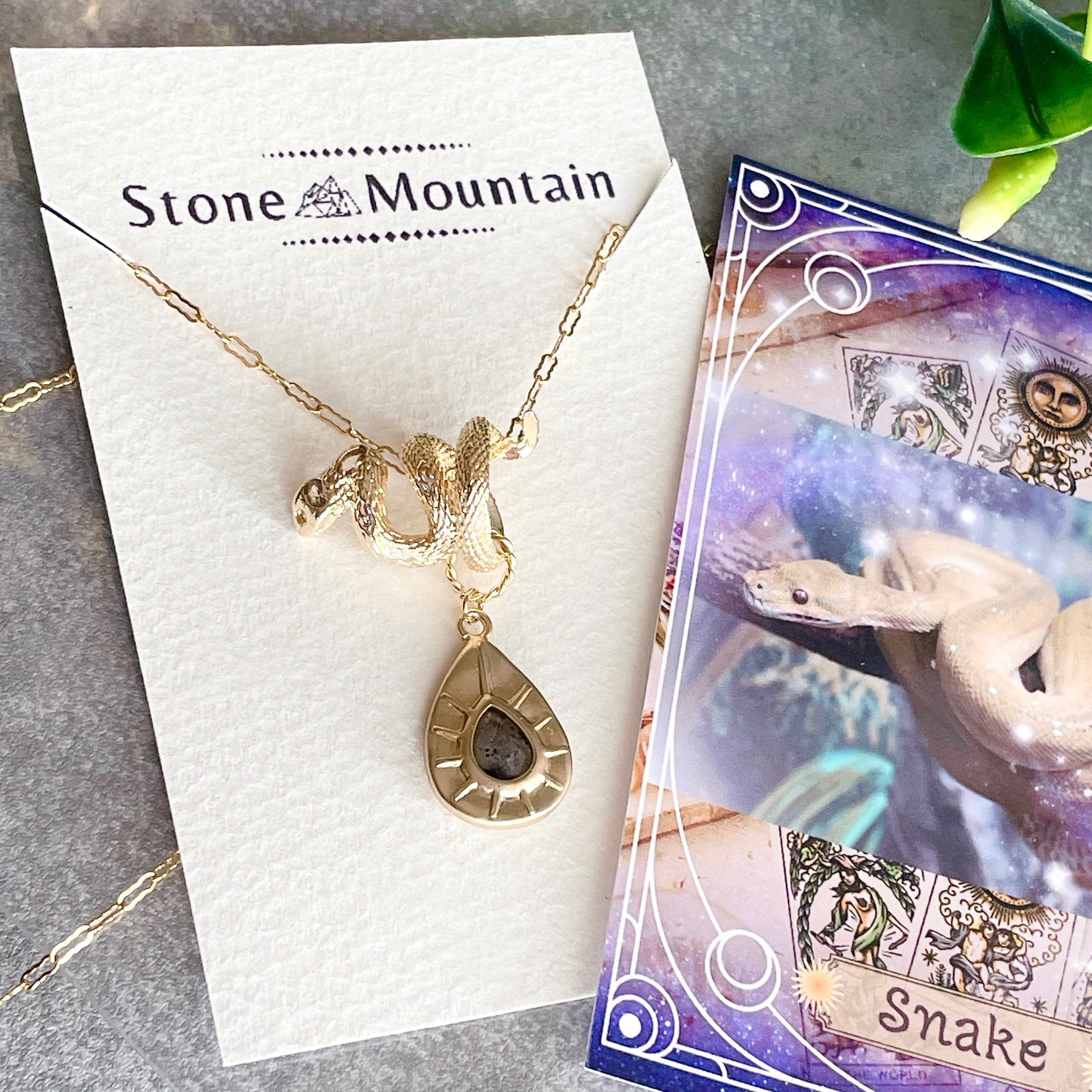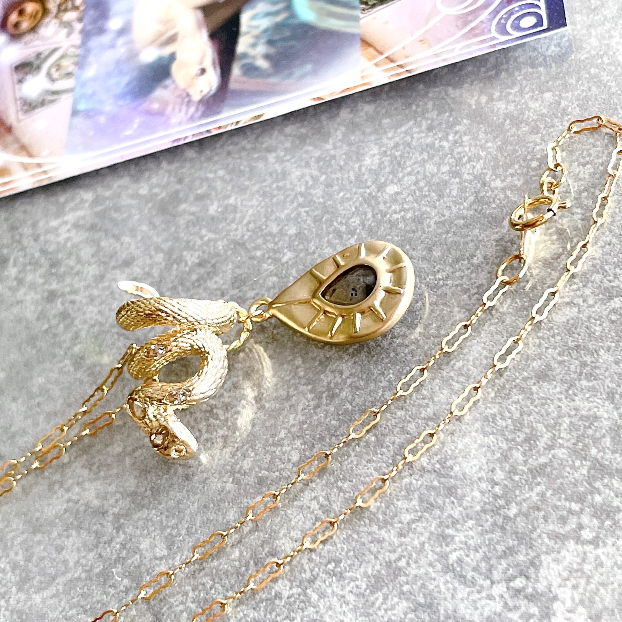 宇宙の神秘的なエネルギーを秘めたラブラドライトと、神の使いといわれる蛇をモチーフにしたパーツを組み合わせたネックレスです。あなたを高次元へと導くサポートをしてくれることでしょう (*˘︶˘人)