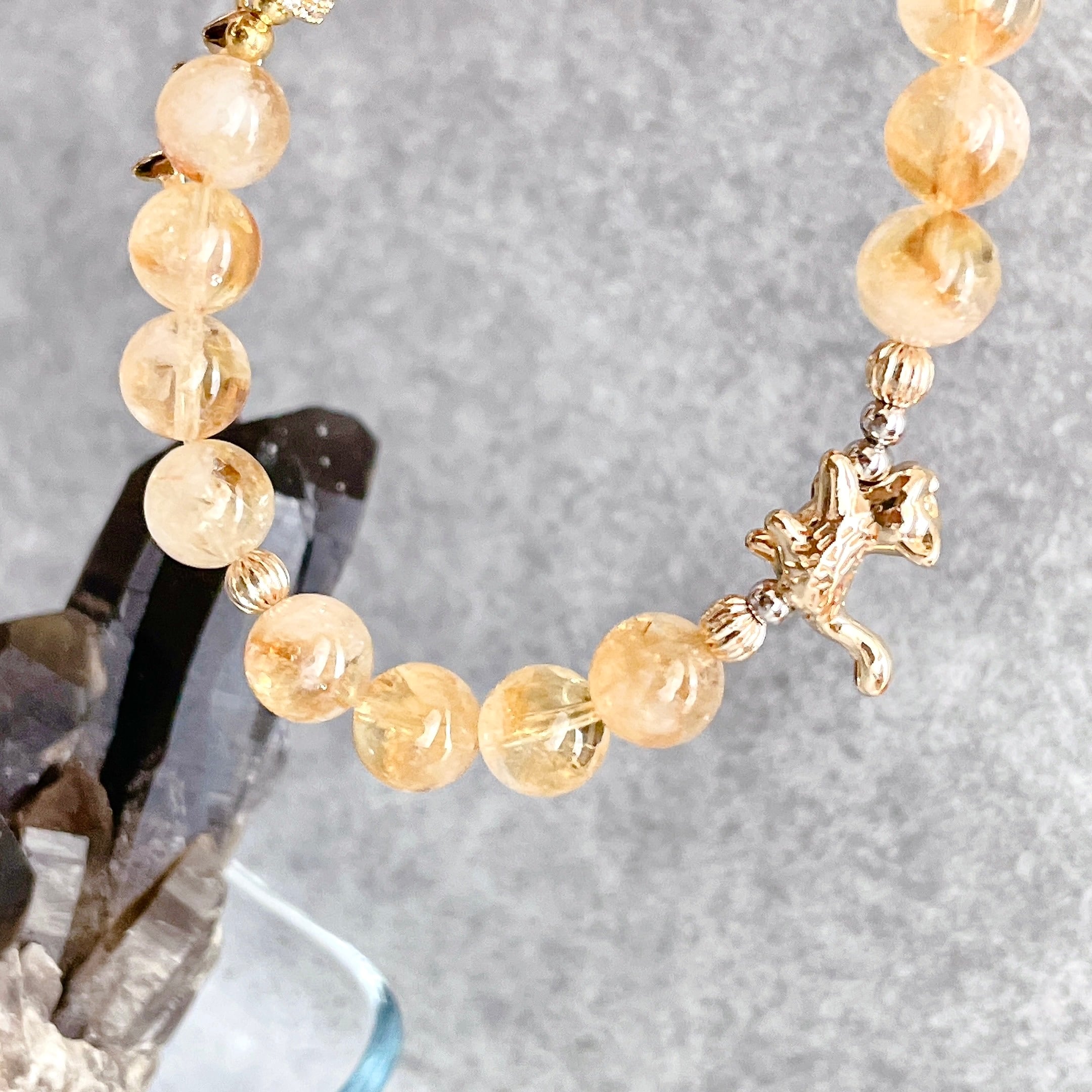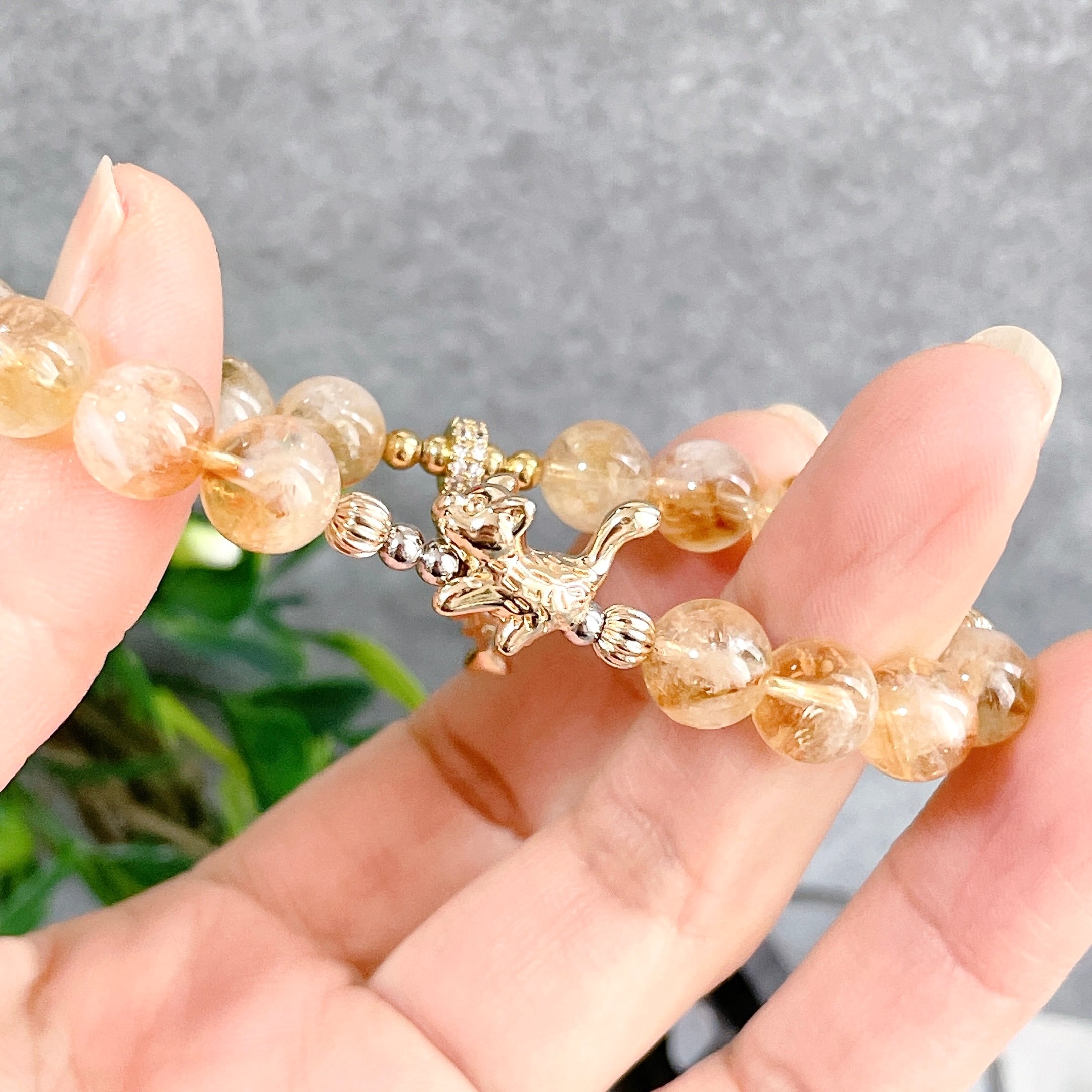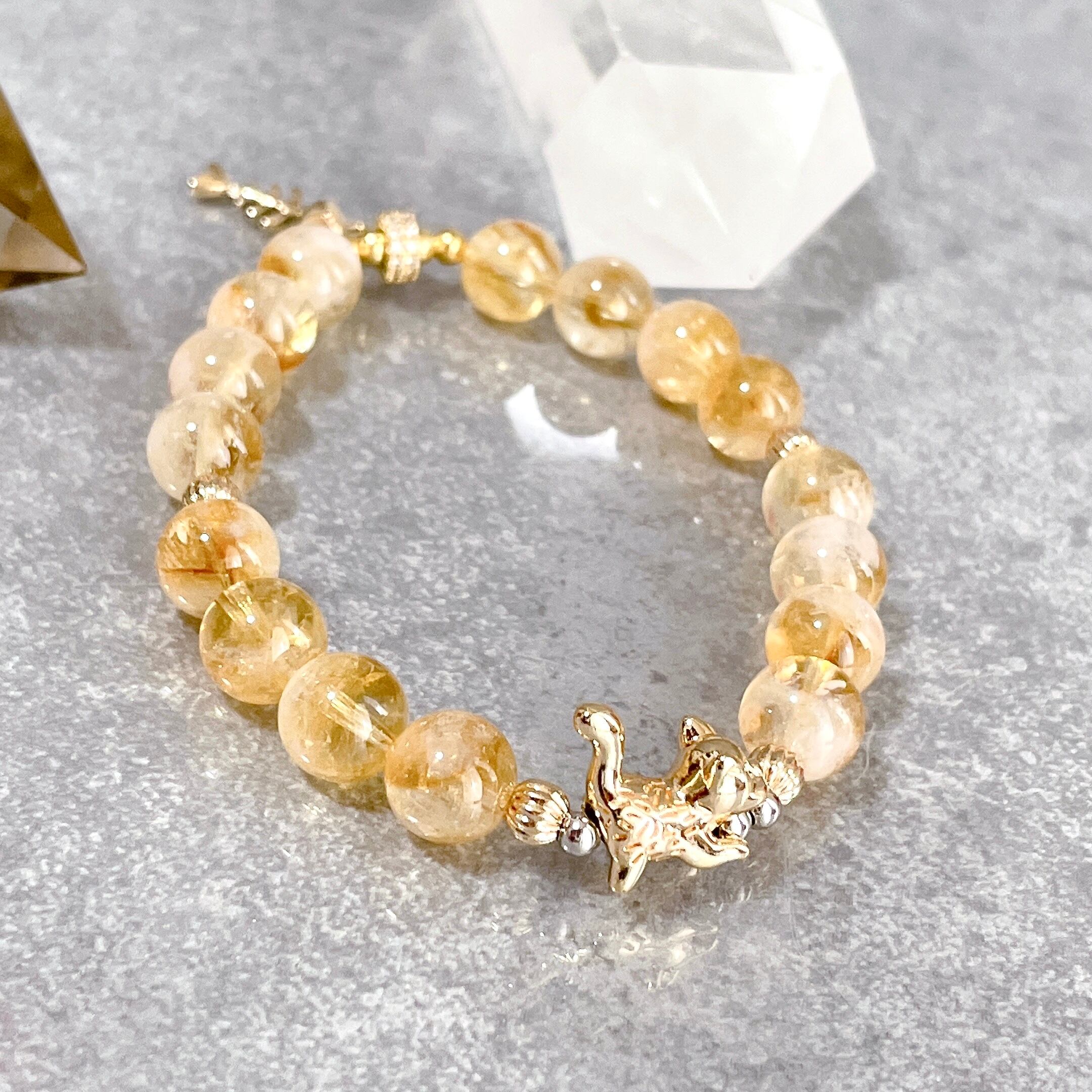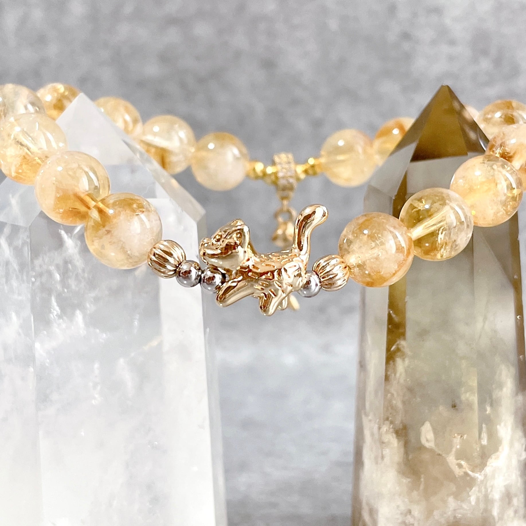 バイカラーシトリン × 猫 天然石ブレスレット 魚の骨チャーム付