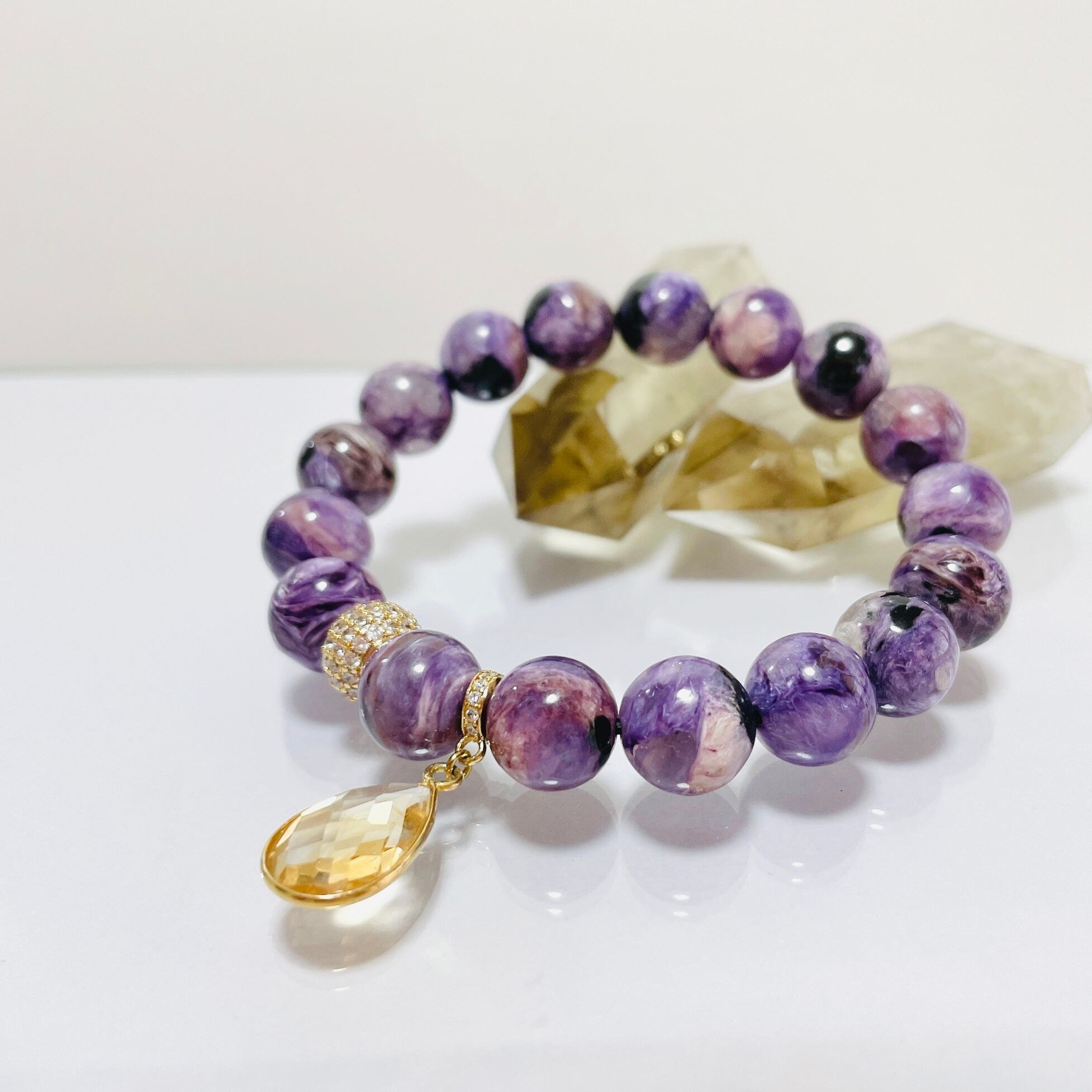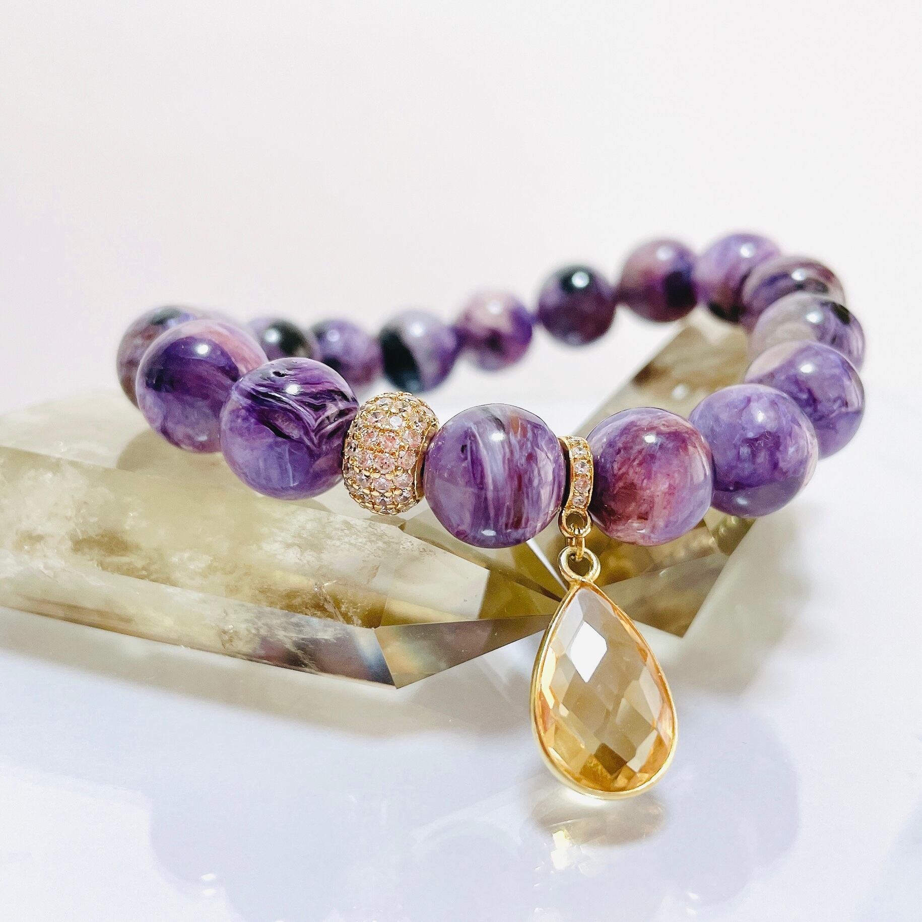 パープルのマーブル模様が魅力的なエンジェルシリカのブレスレットにペアシェイプカットされたシトリンチャームを付けてみました。シトリンチャームは、両面にカットが施されたブラジル産シトリンに18金コーティングされた枠がついているため華やかで高級感のある印象に仕上がっています。