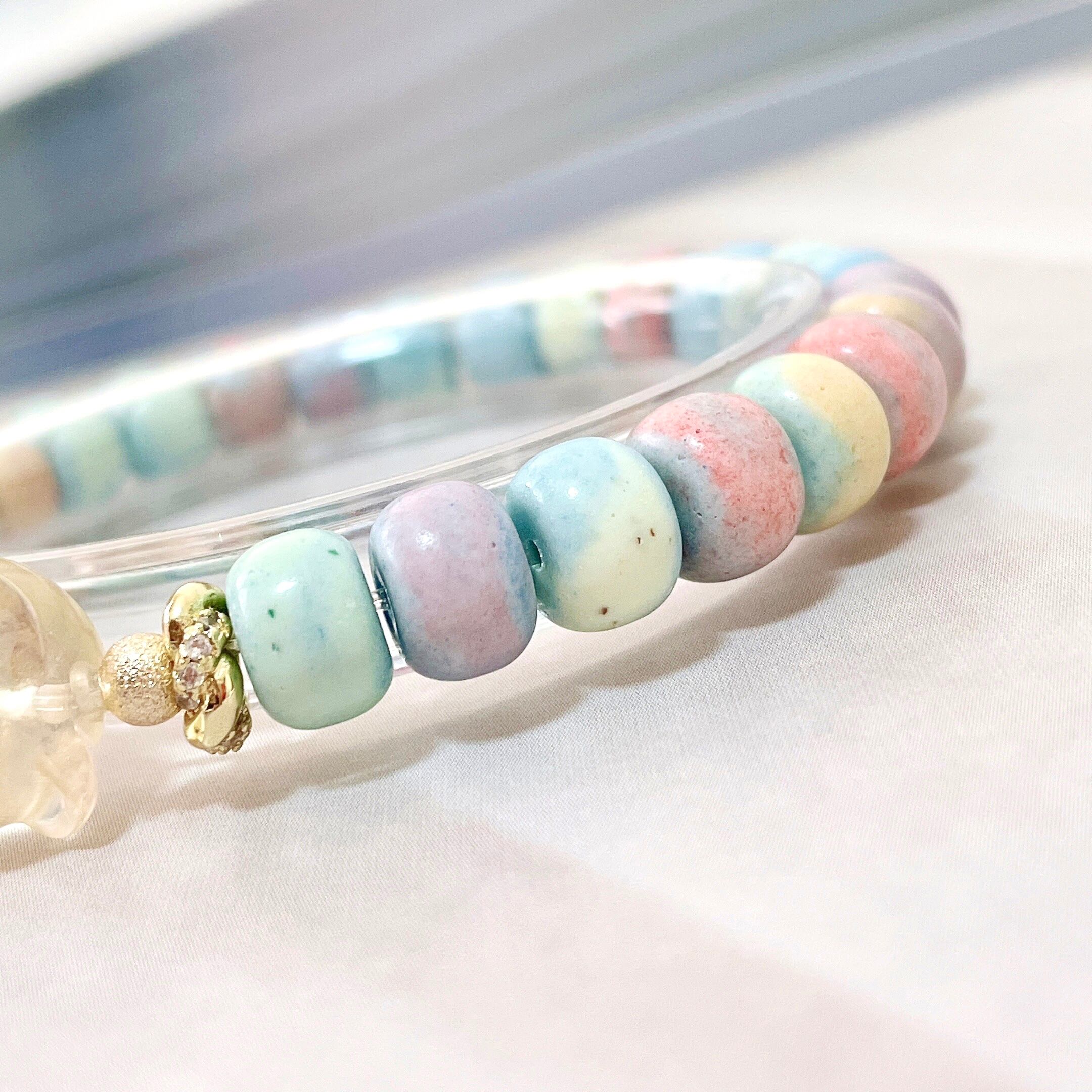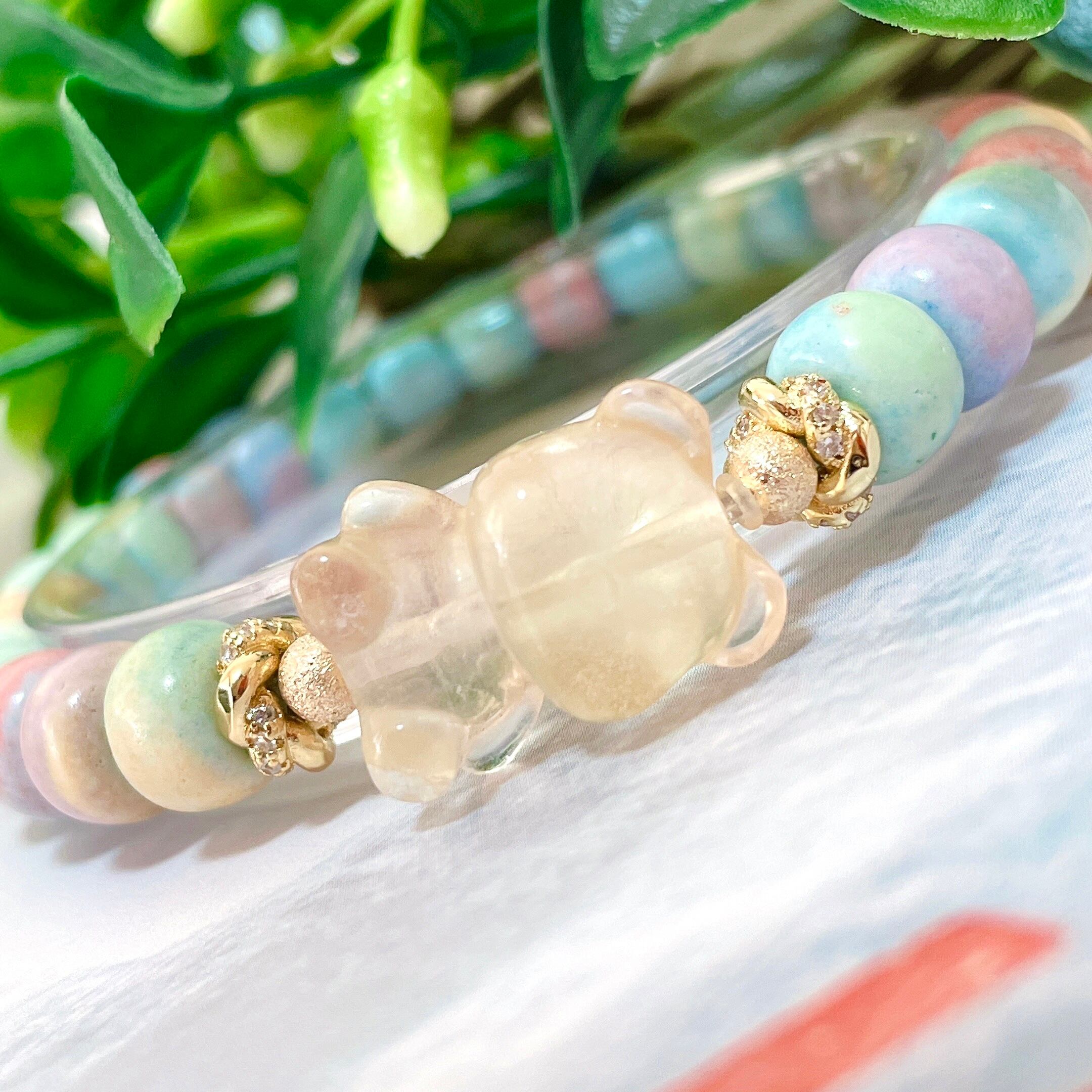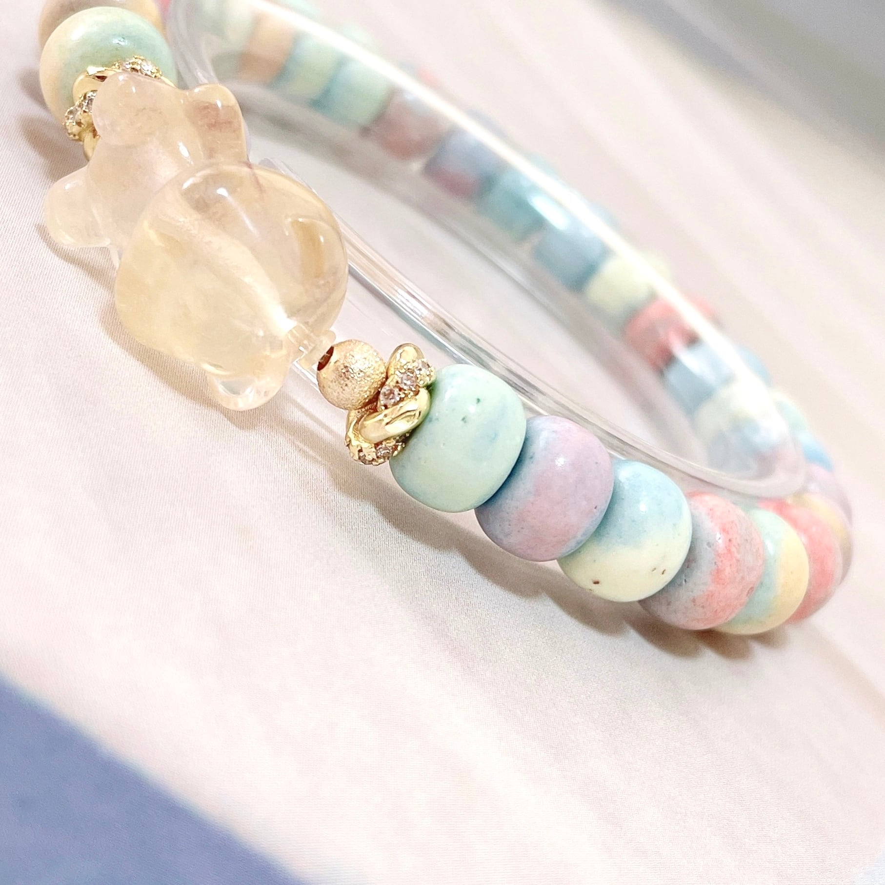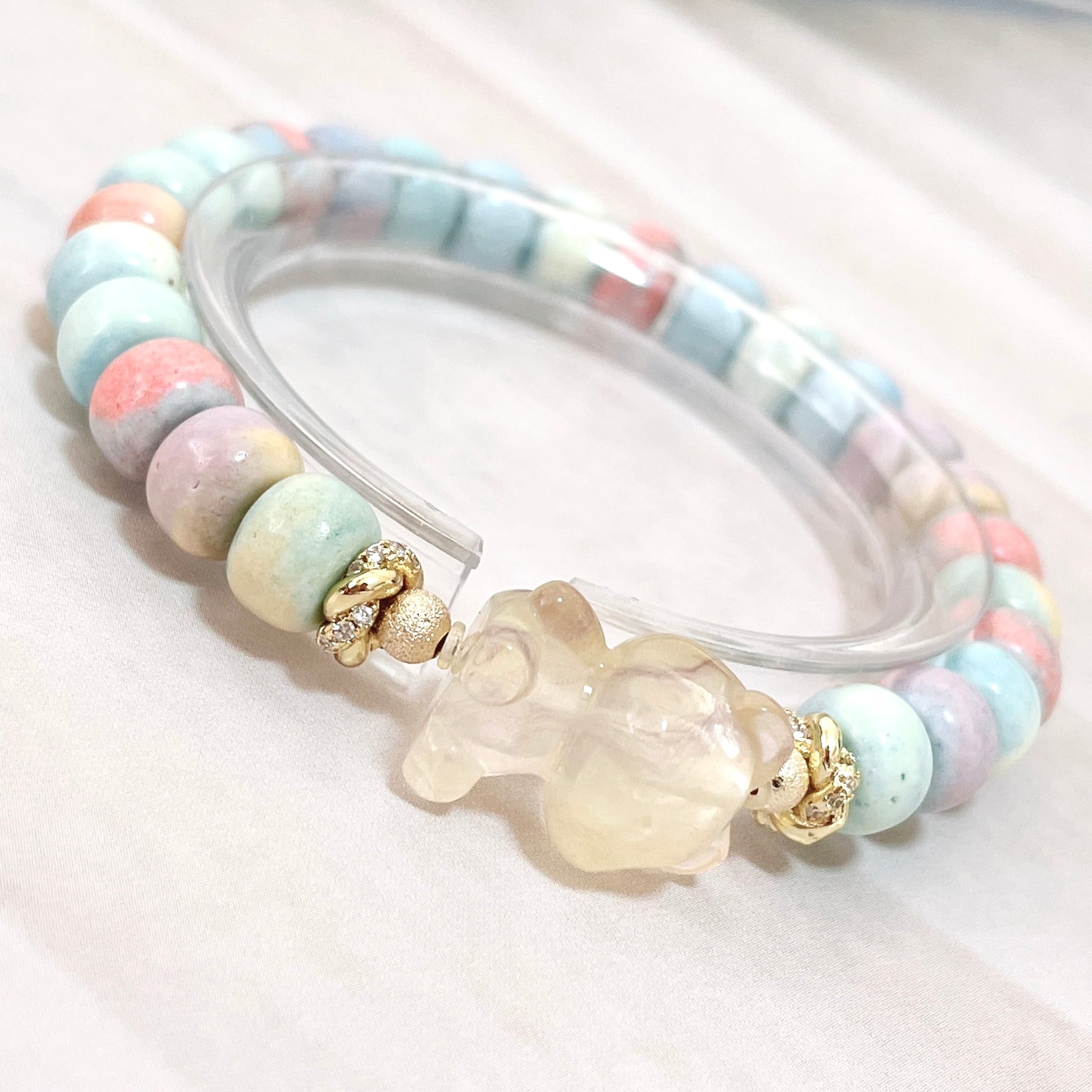 クマさんの形をしたフローライトに、パステルカラーが可愛いアラシャンアゲートを組み合わせたブレスレットになります。